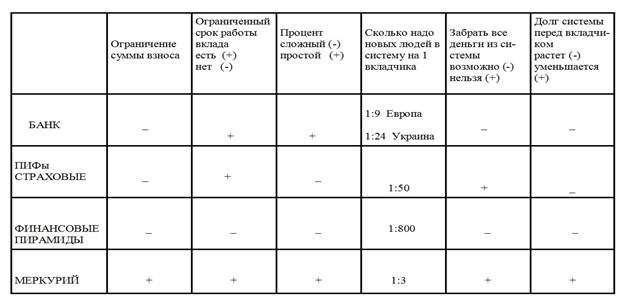 Мы – это ПМВФ – Проект Меркурий Взаимны Фонд. Меркурий является социально-финансовым инструментом, на основе которого формируется международное сообщество людей. Члены сообщества благодаря принципам доверия и взаимопомощи, используя математически просчитанную и стабильную финансово систему, выходят на уровень финансового достатка. Внутри нашего сообщества, каждый его член, не зависимо от социального статуса, рода деятельности и других социологических моментов имеет возможность создать себе и своим близким стабильный источник финансового обеспечения для достижения уровня достатка. В нашем сообществе есть четкий план развития данной системы. И так, как можно сделать так, чтобы денег у нас было всегда достаточно? Скажите, пожалуйста, где, по вашему мнению, больше всего накапливается и крутится денег? - Да, это: банки, ПИФы (пенсионные накопительные инвестиционные фонды, страховые компании), финансовые пирамиды (туда идет много людей, и несут много денег потому, что хотят заработать быстро и много) и уже скоро два года, как существуем мы – ПМВФ. У всех этих выше перечисленных финансовых системах есть те факторы в управлении системой, которые или дают возможность стабилизировать систему, давая ей гарантии на дальнейшее существование и развитие, или наоборот – те факторы, которые дестабилизируют эту систему и приводят к ее разрушению. Таблица №1. Разъяснение таблицы смотрите ниже.