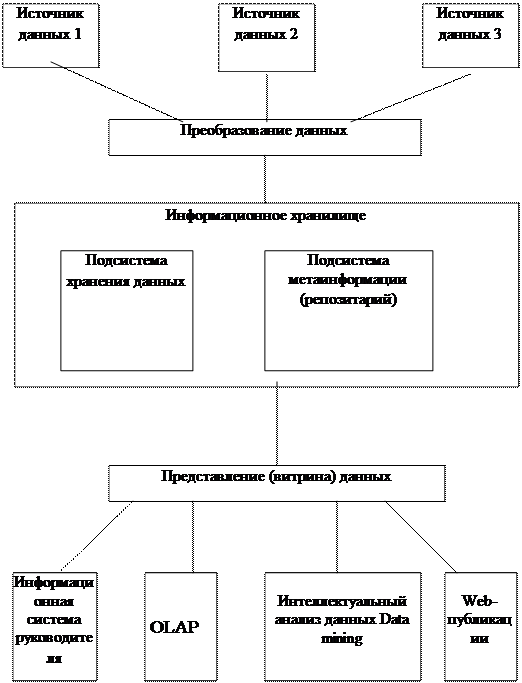 Информационные хранилища (Data Warehousing) – это новый этап представления данных в рамках современных бизнес-процессов. Концепция DW предложена в 1990 году Б. Инмоном и стала одной из доминирующих в разработке информационных технологий обработки данных 90-х годов. По Инмону DW – есть предметно-ориентированный, интегрированный, неизменный, поддерживающий хронологию набор данных, предназначенный для поддержки принятия решений. В этом определении соединены две различные функции: сбор, организация, подготовка данных для анализа в виде постоянно наращиваемой БД; собственно анализ, как элемент принятия решений.