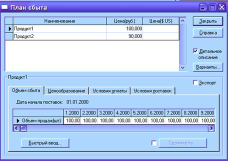 Во вкладке «План сбыта» указываем информацию об объемах продаж, ценах на Продукт 1 и Продукт 2.