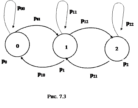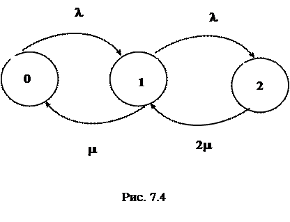 Рассмотрим случай для m=2. Тогда система будет иметь три состояния: k=0 –свободны все приборы, k=1 - занят один прибор, k=2 – заняты оба прибора. Диаграмма переходов из состояния в состояние показана на рис. 7.3.