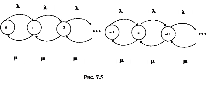Рассмотрим подробно СМО с ожиданием с одним прибором обслуживания и бесконечной очередью. Для нее диаграмма переходов из состояния в состояние показана на рис 7.5.