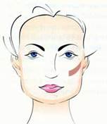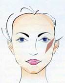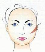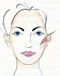День. Можно на все лицо нанести тональное средство, которое несколько темнее кожи. Тем самым мы визуально уменьшим лицо. Румяна наносим на виски и уголки нижней челюсти. Накладываем румяна под скуловые косточки, как можно более вертикально. "Румянец" должен быть не в виде растушеванной полосы, а более округлым, каплевидным.