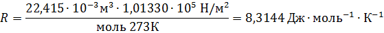 Если объем газа измерен в литрах, а давление газа в мегапаскалях (МПа=106Па), то R=0,083л∙МПа∙моль-1∙К-1. В расчетах обычно используют числа, имеющие три значащие цифры, что дает вполне достаточную точность: 22,4910-3 м3, 22,4 л, 273 К, 8,31 Дж∙моль-1∙К-1.