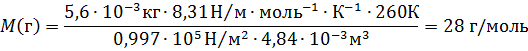 Пример 3. Некоторый газ массой 5,6 г занимает объём 4,84 л притемпературе 170С и давлении 0,997∙105 Па. Чему равна относительная молекулярная масса этого газа?