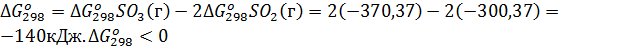 для химической реакции 2SO2(г)+О2(г)↔2SO3(г). В каком направлении может протекать эта реакция в стандартных условиях?