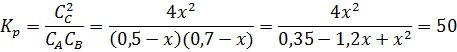 СА = (0,5 х) моль · л-1; СВ = (0,7-х) моль · л-1; СС = 2х моль · л-1