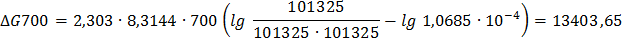 Пример 3. Определение изменения энергии Гиббса Go реакции по значению константы равновесия Кр. Рассчитайте энергию Гиббса и определите возможность протекания реакции СО + Cl2 = COCl2 при 700К, если константа равновесия равна Кр = 1,0685 · 10-4. Парциальное давление всех реагирующих веществ одинаково и равно 101325 Па.
