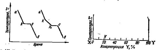 На рис. 15 слева показано, какой вид имеет кривая охлаж­дения чистого расплавленного металла. Сначала понижение тем­пературы плавно идет по кривой ak. В точке k происходит перелом кривой, начинается образование твердой фазы (кристаллизация), сопровождающееся выделением теплоты, вследствие чего темпера­тура некоторое время остается постоянной (кривая идет парал­лельно оси абсцисс). Когда вся масса расплавленного металла затвердеет, опять начинается плавное понижение температуры по кривой св.
