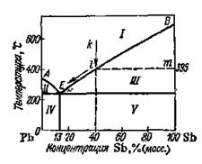 Рассмотрим подробнее процесс кристаллизации расплава. Пусть это будет расплав, содержащий 40% Sb и 60% Рb (точка k на рис. 17). При охлаждении этого расплава до 395 °С (точка l) из него начнут выпадать кристаллы. Это будут кристаллы избы­точного по сравнению с эвтектикой компонента, в данном случае — сурьмы. Теперь сплав стал двухфазным. На диаграмме состояния ему отвечают две точки: точка l (расплав) и точка m (кристаллы сурьмы). Кристаллизация некоторого количества сурьмы изменит состав расплава; он станет беднее сурьмой и, следовательно, бо­гаче свинцом. Точка на диаграмме, отвечающая расплаву, сме­стится немного влево. Поскольку охлаждение продолжается, эта точка вновь дойдет до кривой — из расплава снова выпадет ка­кое-то количество кристаллов сурьмы. Таким образом, по мере охлаждения и кристаллизации точка, отвечающая расплаву, дви­гается вниз и влево по кривой кристаллизации сурьмы, а точка, отвечающая кристаллам сурьмы, — вниз по правой вертикальной оси. Когда расплав достигнет эвтектического состава, из него ста­нут выпадать очень мелкие кристаллы обоих компонентов (эвтек­тика), пока не закристаллизуется все взятое количество вещества. Получившийся сплав будет представлять собою смесь эвтектики с кристаллами сурьмы.