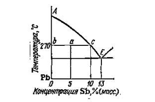Как уже говорилось, по горизонтальной оси диаграмм состоя­ния откладывается состав взятого сплава. Однако для областей, отвечающих равновесию двух фаз, по этой оси можно также устанавливать составы этих фаз. Пусть, например, сплав 5% Sb и 95% Рb нагрет до 270 °С. Такому сплаву отвечает точка а на диа­грамме состояния (рис. 18). Проведем через эту точку горизонталь до пересечения с ближайшими линиями диаграммы. Мы получим точки b и с. Они показывают, что взятому сплаву при 270 °С отвечает равновесие кристаллов свинца (точка b) с распла­вом, состав которого определяется абсциссой точки с (приблизи­тельно 10% Sb и 90% Рb).