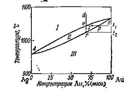 Рассмотрим, как происходит кристаллизация расплавов в этом случае. Пусть исходный жидкий сплав соответствует точке d на диаграмме (рис. 19). При охлаждении его до температуры t1 (точка е) начинается кристаллизация. Кристаллы представляют собой твердый раствор, более богатый тугоплавким компонен­том золотом (точка р). Поэтому в ходе кристаллизации жидкая фаза обедняется тугоплавким компонентом, и точка диаграммы, отвечающая расплаву, смещается несколько влево. По мере охла­ждения эта точка движется вниз, вновь доходит до кривой и про­цесс кристаллизации продолжается. Таким образом, охлаждение расплава сопровождается выпадением кристаллов твердого рас­твора, обогащенных тугоплавким компонентом — золотом, и обога­щением расплава легкоплавким компонентом — серебром. Соот­ветствующие точки на диаграмме при этом перемещаются: состав жидкой фазы изменяется по верхней линии, а состав твердого раствора — по нижней. При медленном проведении процесса кристаллизация заканчивается по достижении такой температуры t2, при которой образующиеся кристаллы имеют состав исходного сплава (точка r).