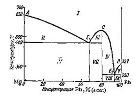 Нетрудно понять, что области I на, рис. 21 отвечает жидкий сплав, областям II—V—равновесия жидкого сплава и соответ­ствующих кристаллов (в области II — кристаллы Mg, в. областях III и IV— кристаллы Mg2Pb, в области V — кристаллы РЬ), а областям VI — IX — твердые сплавы (Mg + эвтектика Е1 (VI), Mg2Pb + эвтектика Е1 (VII), Mg2Pb + эвтектика Е2 (VIII), Pb + эвтектика E2 (IX)).