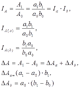 Рассмотрим влияние различных факторов на изменение изучаемого явления за отчетный и базисный периоды времени. Предположим, что явление «А» зависит от двух факторов «a» и «b», тогда динамика этого показателя будет следующая: