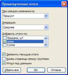 Пример 4. В базе данных (рис. 1) нужно подвести итоги по полю Оборудование– вывести среднюю цену. Для этого необходимо выполнить команду Данные – Итоги. В диалоговом окне Промежуточные итоги установить параметры в соответствии с рис. 1 6.