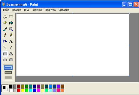 Графический редактор Paint предназначен для работы с растровыми изображениями. Он запускается командой Пуск èВсе программы è Стандартные è Paint. Основную часть окна составляет рабочая область. Слева от рабочей области – Панель инструментов, под ней – окно свойств каждого инструмента, ниже рабочей области – палитра цветов, наверху – меню.