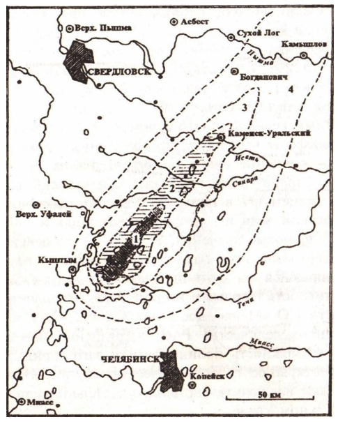В 1957 г. в результате теплового взрыва емкости с РАО произошел мощный выброс радионуклидов (церий-144, цирконий-95, стронций-90, цезий-137 и др.) с суммарной активностью 2 млн. Кu., возник «уральский радиоактивный след» длиной до 110 км (в результате последующей миграции даже до 400 км) и шириной до 35-50 км (рис.12). Общая площадь загрязненной территории, ограниченной изолинией 0,1 Кu/км2 по стронцию-90, составила 23 тыс. км2. Около 10 тыс. человек из 19 населенных пунктов в зоне наиболее сильного загрязнения с большой задержкой были эвакуированы и переселены.