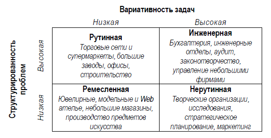 Надо заметить, что многие организации не попадают точно в один из секторов матрицы, другими словами, технологию их деятельности трудно привести точно к одному из указанных четырех типов. Так, например, образовательная технология в вузах соединяет в себе черты как ремесленной, так и не рутинной технологии, технология производства программных продуктов в IT-компаниях – инженерной и не рутинной, производство небольших партий одежды определенного стиля в пошивочных ателье и домах моды – рутинной и ремесленной.
