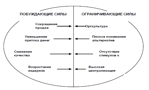 Модель организационных изменений, разработанная американским социопсихологом Куртом Левиным, до сих пор достаточно популярна и активно используется в практике управления организациями. Суть модели в том, что в организации существуют две группы факторов, взаимодействие которых обеспечивает поддержание равновесия и стабильности или изменения. Это «побуждающие силы», которые подталкивают организацию к изменениям, и «ограничивающие силы», направленные на стабилизацию.