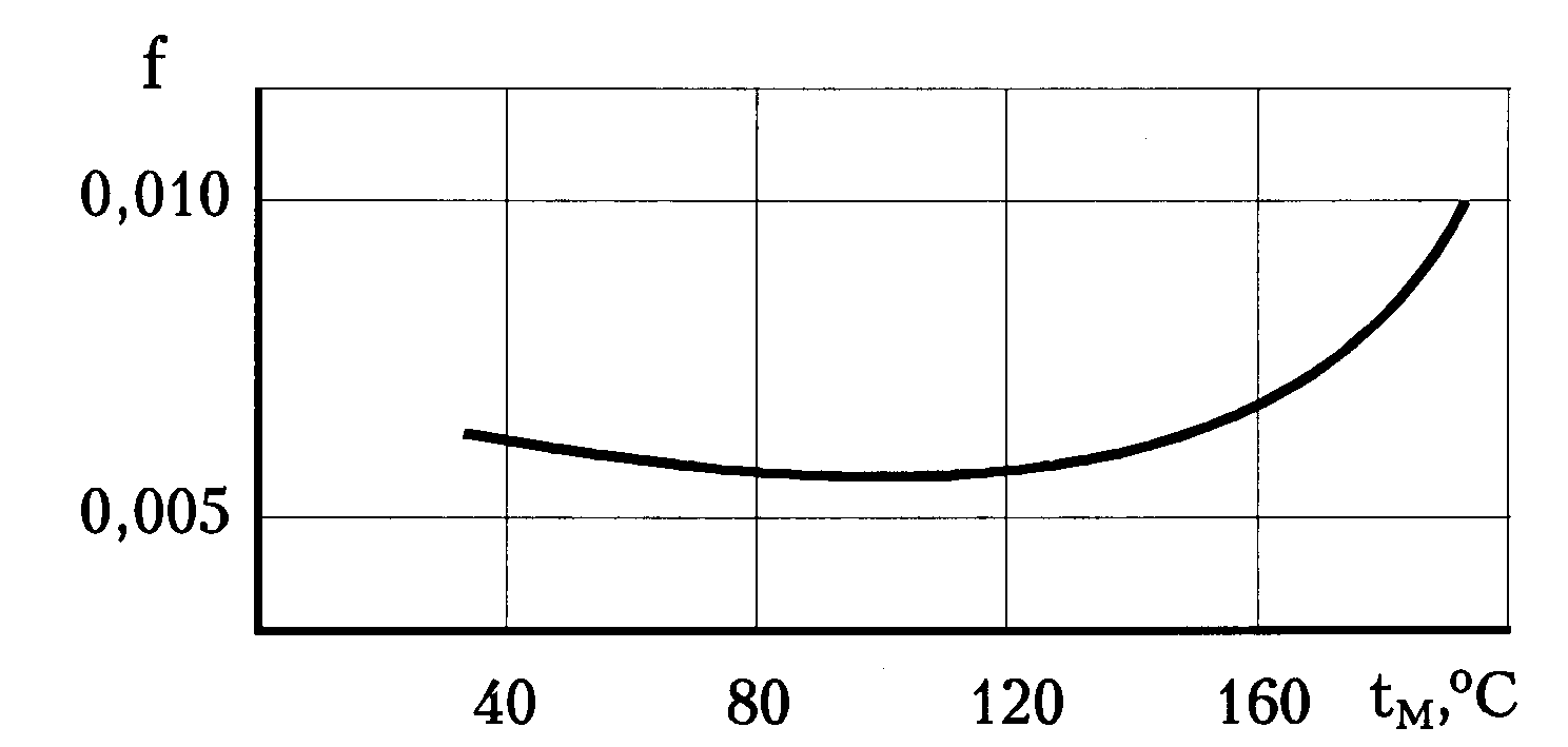 | Рис.3.14. Зависимость коэффициента трения f алюминиевого сплава по стали при смазке дизельным маслом от температуры tM масла [23] | |