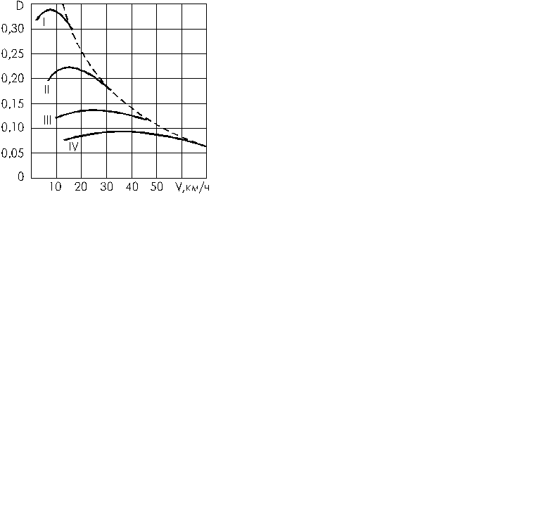 Переменность режимов работы агрегатов обусловлена переключением передач, а число переключений на 1 км максимально при Vmin. При этом же наблюдается и максимум среднего передаточного числа коробки передач ik. Диапазон используемых на каждой передаче скоростей возрастает с повышениемих порядкового номера, что следует из типичной формы динамической характеристики автомобиля (рис.3.51). Следовательно, с ростом V повышается время использования передач в порядке возрастания их номеров, что ведет к снижению среднего передаточного числа коробки передач ik. Огибающая динамической характеристики автомобиля обычно имеет гиперболический характер, что справедливо и для зависимости ik от V. Но поскольку использование первой передачи характерно при V < Vmin, то в рассматриваемом диапазоне скорости от Vmin до V эту зависимость целесообразно описать экспонентой в форме