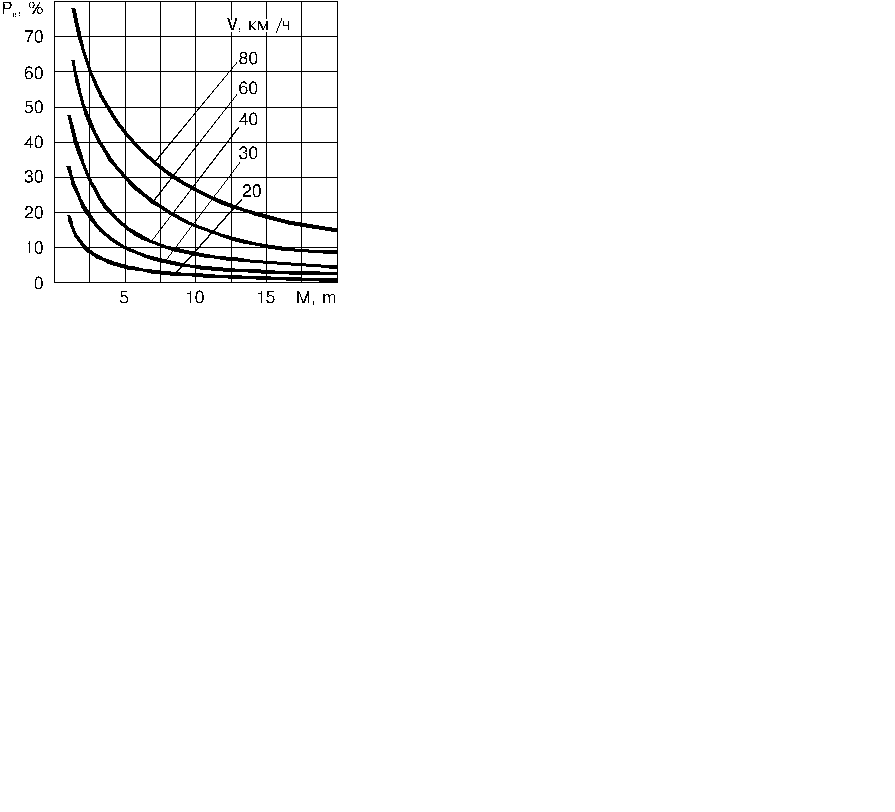 В этом уравнении нагрузка на автомобиль и сопротивление дороги входят в первый член. Третий член за длительный промежуток времени (рабочая смена) в среднем равен нулю, так как за это время наблюдается как ускорение, так и замедление. Второй член уравнения для грузовых автомобилей незначителен, о чем свидетельствует доля его в общей силе тяги в зависимости от массы автомобиля и скорости (рис.3.53). Видно, что значительная доля Рb для легковых автомобилей находится в области высоких скоростей (V>50 км/ч).