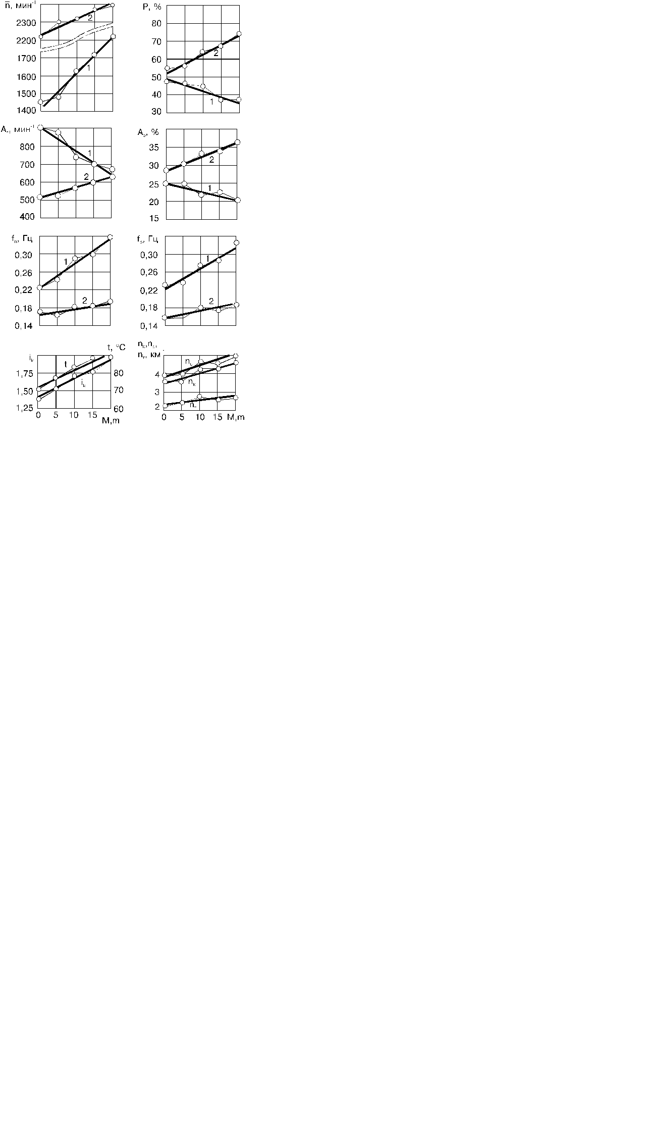 Рис.3.54. Зависимость показателей режимов работы элементов автомобилей КамАЗ от массы перевозимого груза: 1 - городские; 2 - загородные маршруты