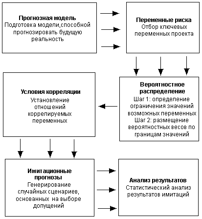 Анализ рисков с использованием метода имитационного моделирования Монте-Карло представляет собой «воссоединение» методов анализа чувствительности и анализа сценариев на базе теории вероятностей.