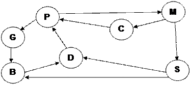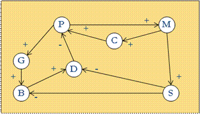 Дуга (Р, G) имеет знак плюс, поскольку рост городского населения ведет, при прочих равных условиях, к увеличению количества мусора. Дуга (D, Р) имеет знак минус, так как рост заболеваемости ведет к уменьшению численности населения, а уменьшение заболеваемости — к увеличению. Дуга (Р, М) имеет знак плюс, так как рост населения ведет к улучшению инфраструктуры города, т. е. к улучшению условий жизни. Дуга (М, С) имеет знак плюс, так как улучшение условий жизни увеличивает миграцию населения в город, что, в свою очередь, ведет к росту населения — дуга (С, Р). Улучшение условий жизни в городе ведет к увеличению числа очистных сооружений — дуга (М, S) и т.д.