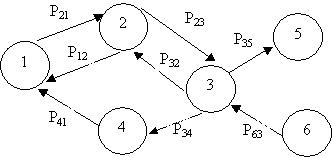 Р = {Р12, Р21,Р23, Р32,Р31,Р34,Р35,Р36,Р41} - вектор мер возможностей перехода из узла I в узел j.