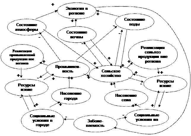 Региональную модель представим в виде двух орграфов: первый описывает взаимодействие крупных блоков региона, второй более детализирован (рис. 3.24, 3.25).