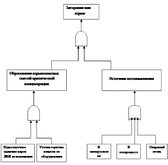 Головным событием, в этом в этом случае будет событие Е – загорание или взрыв в помещении. Реализация головного события возможна только при совпадении двух событий – образование горючих и взрывоопасных смесей критических концентраций и наличия источника воспламенения. Поэтому здесь использован логический символ «И».