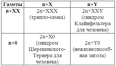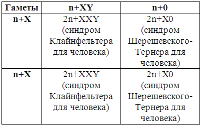 Из таблицы видно, что при нормальном прохождении мейоза у самца и самки все возникшие зиготы несут нормальный набор хромосом и, следовательно, могут развиться в нормальных самцов и самок.