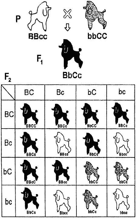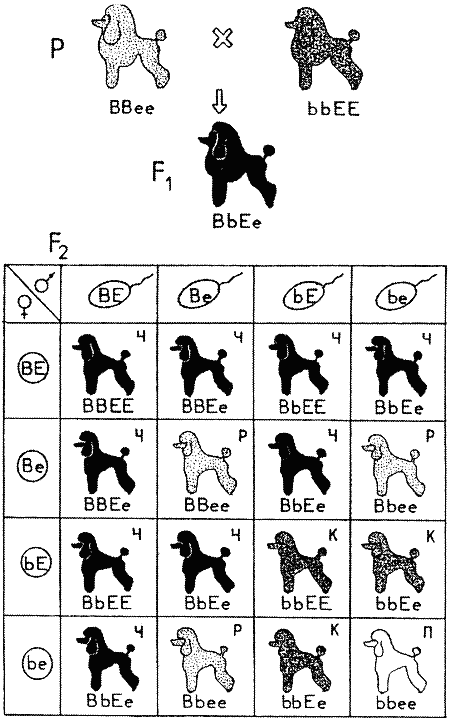 Рис. 18. Комплементарное взаимодействие генов, определяющих окраску собак: соотношение — 9 черных (Ч): 3 коричневых (К): 3 рыжих (Р): 1 палевая (П)