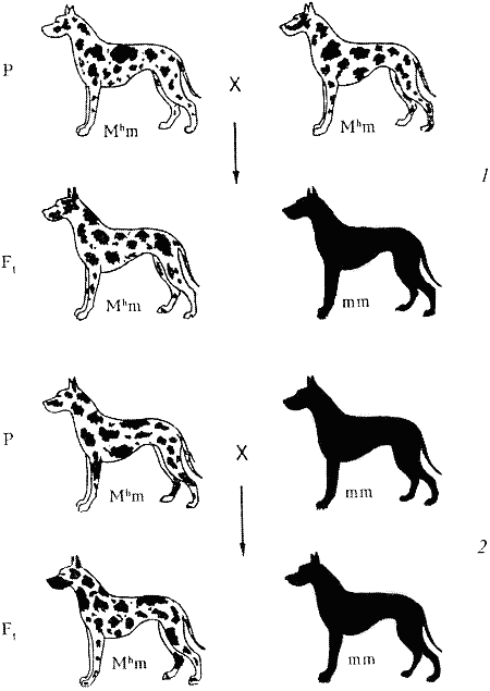 Рис. 20. Наследование мраморности типа «арлекин» у догов. Ген М h (фактор Мерля) — доминантный с рецессивным летальным действием: 1 — скрещивание мраморных догов между собой; 2 — анализирующее скрещивание