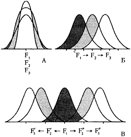 Рис. 24. Формы естественного отбора (по Тимофееву-Ресовскому и др., 1974): А — стабилизирующий отбор; Б — движущий отбор; В — дизруптивний (разрывающий) отбор F-поколения. На популяционных кривых заштрихованы отметаемые отбором варианты