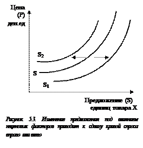 Влияние данных факторов приводит к сдвигу кривой предложения. Повышение цен на факторы производства, например, означает сокращение предложения. Одновременно происходит сдвиг кривой предложения влево в положение S2S2. В случае снижения цены произойдет увеличение предложения, что приведет к сдвигу кривой предложения вправо в положение S1S1 (рис. 5.3).
