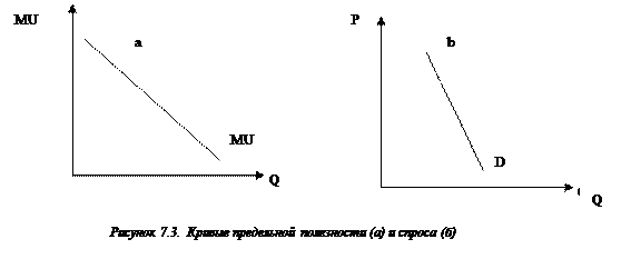 Закон убывающей предельной полезности объясняет отрицательную направленность кривой спроса: каждый потребитель в соответствии со снижающейся полезностью товара покупает его большее количество только при условии снижения цены. Поэтому кривые предельной полезности и спроса похожи друг на друга (рис. 7.3).