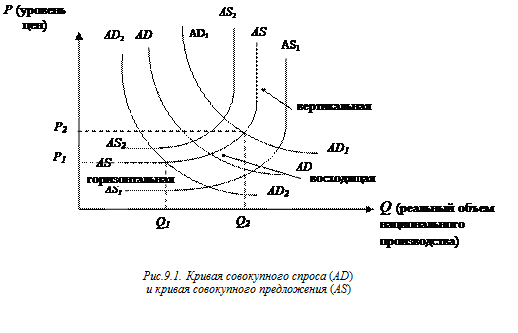 Кривая совокупного спроса AD дает такие комбинации объема выпуска и общего уровня цен в экономике, при которых товарный и денежный рынки находятся в равновесии (рис. 9.1). Движение вдоль кривой AD отражает изменение совокупного спроса в зависимости от динамики общего уровня цен. Наиболее простое выражение этой зависимости можно получить из уравнения количественной теории денег: MV=PQ,