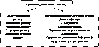 Прийоми ризик-менеджменту складаються з засобів вирішення ризику (підходи до вирішення ризику) та прийомів зниження ступеню ризику (Рис.8.).