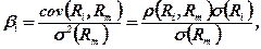 где Ri – доходность i-го капитального актива (акции); Rm – общий рыночный средний уровень дохода; σ(Ri), σ(Rm) – среднеквадратическое отклонение відповідно i-гo капітального активу та загально ринкової доходності; cov(Ri, Rm) — коваріація доходності і-го активу та доходності ринку; р (Ri, Rm) — коефіцієнт кореляції доходності i-х цінних паперів та ринкової ставки доходу.