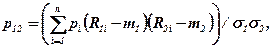 где р12 – коэффициент корреляции первой и второй акции; m1 – ожидаемая норма прибыли первой акции; m2 – ожидаемая норма прибыли второй акции; R1t – возможная норма прибыли первой акции (i = 1^, n); R2t – возможная норма прибыли второй акции (i = 1^, n); рi – имоверность соответственно возможных норм прибыли (i = 1^, n); σ1, σ2 – среднеквадратическое отклонение соответственно первой и второй акции.