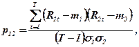 де Т - кількість попередніх періодів, для яких маємо інформацiю; R1t — норма прибутку першого цінного паперу в t-му періоді; R2t— норма прибутку другого цінного паперу в t-му періоді; m1—сподівана норма прибутку першого цінного паперу, обчислена згідно з формулою (4.3); m2—сподівана норма прибутку другого цінного паперу, обчислена згідно з формулою (4.3); "σ1", "σ 2" —ризик (середньоквадратичне відхилення) відповідно першого та другого цінних паперів, обчислений згідно з формулами (4.6) і (4.4).