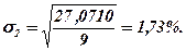 σ1 = (0,1 × 210,25 + 0,3 × 0,25 + 0,2 × 30,35 + 0,1 × 240,25)0,5 = (57,25)0,5 = 7,567;