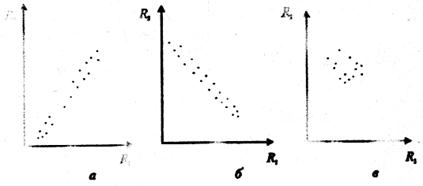 Високим (низьким) нормам прибутку однієї акції вiдповідають за ті ж періоди високі (низькі) норми прибутку другої акції. З рис. 4.1 (б) видно, що відповідна множина точок, кожна з яких характеризує значення норми прибутку акції 1 та 2 заодин період, дуже щільно сконцентрована навколо деякої спадаючої прямої. Високим (низьким) нормам прибутку одній акції вiдповідають за той самий період низькі (високі) норми прибутку другої акції.