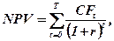де NPV — чиста (нетто) теперішня (поточна) вартість; CFt — чистий (нетто) потік доходів (видатків) у t-му році; Т — кількість розрахункових років; r — норма (ставка) дисконту (з урахуванням ризиків та інфляції),