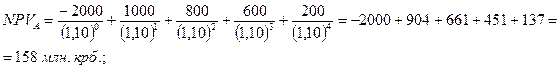 Для обох варіантів одержані величини є додатними, тобто обидва інвестиційні проекти призведуть до зростання вартості фірми. Якщо існують можливості щодо реалізації як проекту А, так і проекту В, то вони повинні бути залучені до інвестиційної програми (до інвестиційного портфеля) фірми. Якщо ж є можливість до реалізації лише одного інвестиційного проекту фірми, то доцільно обрати проект А, бо з ним пов'язана більша величина приросту вартості фірми (NPVA > NPVB).