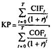 де КР — індекс прибутковості; CIF — потік грошових доходів нетто, що можуть бути отримані у випадку реалізації проекту (складається з прибутків та амортизаційних відрахунків); COF — затрати, необхідні для реалізації інвестиційного проекту; Т — розглядуваний період часу (роки); r — норма дисконту з урахуванням ризиків.