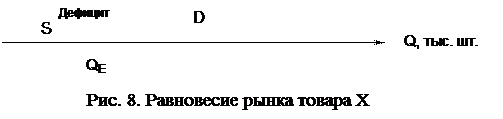 На рис. 8 кривые спроса и предложения пересекаются в точке Е – точке рыночного равновесия. Равновесие рынка – это ситуация, при которой интересы продавцов и покупателей товара взаимно согласуются, а объем спроса равен объему предложения. Параметрами равновесия являются равновесная рыночная цена товара (РЕ =4руб. за единицу товара Х) и равновесный рыночный объем продаж (QE=40 тыс. шт., товара Х).