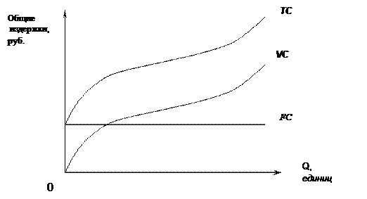 Если по данным таблицы 5 по оси абсцисс будем откладывать объем выпуска Q, а по оси ординат - издержки, то кривая общих постоянных издержек FC будет выглядеть как прямая линия, параллельная оси абсцисс, а кривая общих переменных издержек VC будет представлена кривой, конфигурация которой показывает, что, начиная с нуля, но мере роста Q, общие переменные издержки VC первоначально растут очень быстро, а затем их рост замедляется по сравнению с увеличением Q и, наконец, снова обгоняет рост Q. В сумме общие постоянные издержки FC и общие переменные издержки VC дают общие валовые издержки TC. На рисунке 10 суммирование FC и VC означает сдвиг линии VC вверх на величину FC.