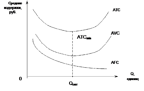 При объеме выпуска продукции, равном Qопт, средние валовые издержки производства минимальны. При данном объеме выпуска фирма оптимизирует свою деятельность с точки зрения минимизации издержек, в рамках краткосрочного периода.
